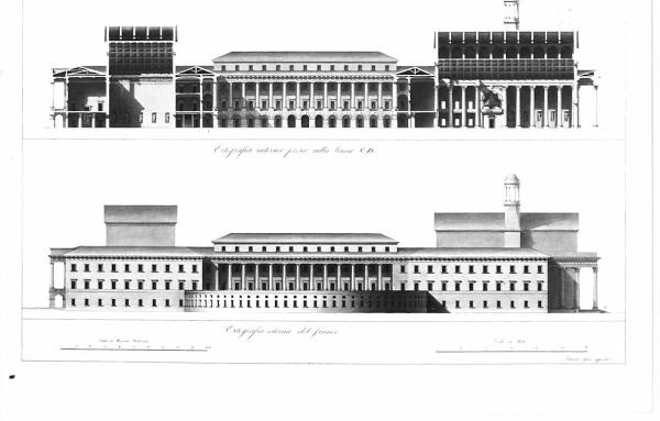 Inf.: prospetto della casa di ritiro per militari invalidi, a china, bistro e acquerello grigio e azzurro con vista del muro dell'esedra, dell'edificio a tre piani, del fianco del tempio e della copertura dell'atrio principale. Sup.: sezione sulla linea long. CD sull'ingresso, sul grande atrio con copertura a volta acssettonata, sul cortile, e dell'interno del tempio. Veduta del sistema di copertura, del colonnato dell'aula e dell'organo.