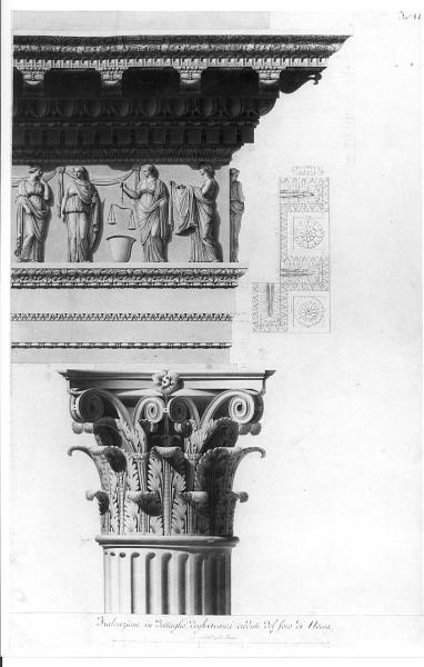 Alzato di un particolare della trabeazione, veduta dal basso verso l'alto della cornice del timpano, a china, bistro, quotato a china rossa, su fondo chiaro, entro linea di margine a china. Inf.: alzato di capitello di ordine corinzio con relativa trabeazione. Sup.: veduta dal basso verso l'alto di un angolo della cornice del timpano, del modiglioni e dei rosoni.