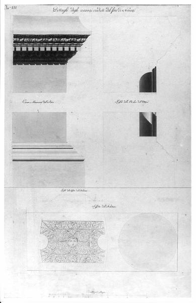 Serie di sei disegni sovrapposti relativi a piante, alzati e profili di particolari del Tempio di Nerva, a china e bistro su fondo chiaro, quotati a china rossa, entro linea di margine a china. Inf.: veduta dal basso di una porzione del soffitto dell'architrave e profilo. Centro: alzato della base dell'attico e particolare del profilo della cornice della nicchia. Sup.: alzato di un particolare della cornice e profilo sup. della nicchia.