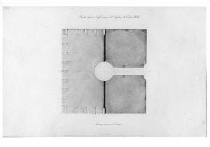 Rilievo della pianta del sepolcro di Cecilia Metella, a china e bistro, con evidenziata la tecnica costruttiva del ciottolato. Quote e linee di sezione a china rossa su fondo chiaro, entro linea di margine a china. Planimetria a due livelli. Al centro della pianta quadrangolare: cella circolare con relativa apertura d'accesso. La pianta circolare del piano sup. è tratteggiata.