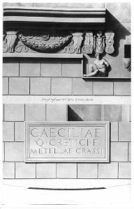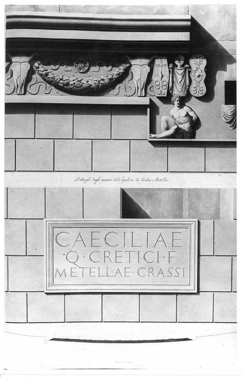Rilievo di una serie di particolari sovrapposti del sepolcro di Cecilia Metella, a china e bistro su fondo chiaro, quotati a china rossa, entro linea di margine a china. Inf.: sezione orizzontale della tabula e alzato della stessa con iscrizione a lettere capitali maiuscole. Sup.: particolare del fregio, formato da festoni di fiori e frutta, alternati da teschi taurini, tra nastri, rosoni e scudi simbolici scolpiti.
