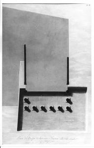 - NOTIZIE STORICO CRITICHE Il disegno appartiene ad una serie di 11 tavole redatte da Giacomo Moraglia come saggio del terzo anno di pensionato a Roma (Atti dell'I.R. Accademia di Belle Arti, 1819, p. 43). Giacomo Moraglia vinse il concorso di II classe per gli ordini architettonici nel 1811 ("Atti dell'I.R. Accademia di Belle Arti", 1811, p. 56) e quello per l'invenzione e la prospettiva nel 1812 (Atti..., 1812, pp. 52, 54). Nel 1814 venne esposto a Brera il progetto per un "Bagno pubblico" e un "Casino di società" ("Atti..., 1814, p. 62). Il foglio è rilegato entro il volume A I 188, contenente vari saggi di pensionato romano svolti tra il 1812 e il 1820. Nel 1817, 1818, 1819, 1820 vennero esposti a Brera i saggi del I, II, III e IV anno di pensionato romano di Giacomo Moraglia (cfr. schede seguenti). Moraglia nacque a Milano nel 1791, fu pensionato a Roma dal 1815, insieme a Cattaneo e Durelli (AAB, Carpi E III, 3) sino al 1821. In seguito lavorò a Milano e in area lombarda. Il 18/ 2/ 1854 divenne consigliere ordinario al posto di Pestagalli e il 18/ 5/ 1854 fu nominato membro ordinario del consiglio dell'Accademia di Brera per la sezione di Architettura (AAB, Carpi A IV).