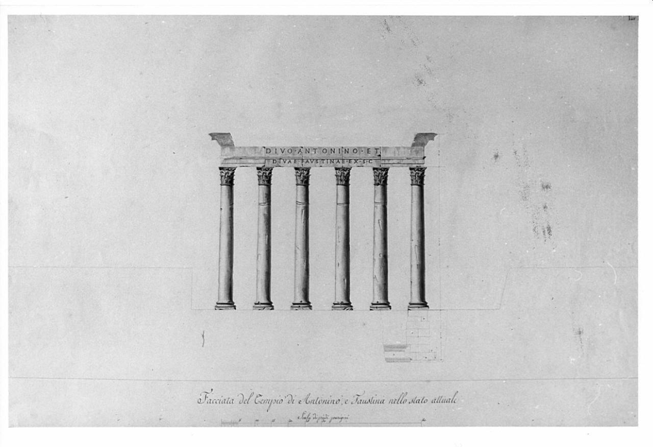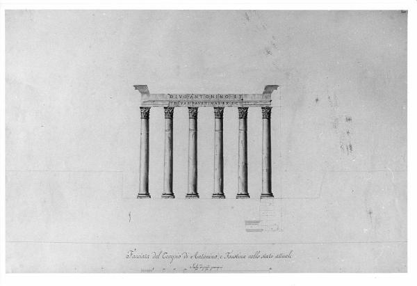 Rilievo del prospetto del Tempio di Antonino e Faustina a china nera, rossa e bistro su fondo chiaro, entro linea di margine a china. Sei colonne lisce con capitello corinzio sorreggono un architrave con iscrizione a lettere capitali maiuscole. Inf.: sezione su una fondazione della colonna. Evidenziato lo stato di degrado.