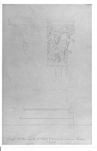 Serie di tre particolari della base, della colonna e del capitello del Tempio di Antonino e Faustina restaurato, a china su fondo chiaro, quotati in rosso, entro linea di margine a china. Inf.: alzato della base della colonna. Sup.: sezione della campana del capitello corinzio e alzato di porzione della colonna e del capitello.