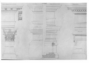 12 particolari esterni di colonne, capitelli e trabeazioni a china e tratteggio rosa su fondo chiaro, entro linea di margine a china. Alzati delle basi delle colonne del cortile e dell'atrio; sezione del parapetto del secondo piano del cortile; dettagli della trabeazione e della finestra esterna.