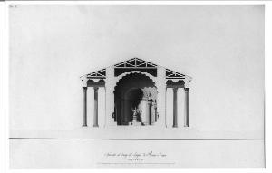- NOTIZIE STORICO CRITICHE Il disegno appartiene ad una serie di 16 tavole redatte da Giovanni Battista Vergani, probabilmente nel 1814, come saggio del terzo anno di pensionato a Roma ed esposto a Brera nel 1817 (esposizione annuale dell'Accademia;"Atti dell'I.R. Accademia delle Belle Arti", 1817, p. 50). Nel 1818 Vergani aggiunse un supplemento ai saggi dei primi tre anni (Atti..., p. 44). Il disegno è rilegato entro il volume A I 188, contenente vari saggi di pensionato romano dal 1812 al 1820. Giovanni Battista Vergani vince il terzo premio di prospettiva nel concorso di II classe del 1808 (Atti..., 1808, p. 62), il secondo premio per la composizione nel concorso di II classe del 1809 (Atti..., 1809, p. 62) e quello per l'invenzione nel concorso del 1810 (Atti..., 1810, p. 66). Tra il 1812 e il 1815 invia da Roma i saggi di pensionato del I, II, III, IV anno che vengono esposti a Brera. Nel 1812 e nel 1816 ottiene premi anche presso l'Accademia di S. Luca a Roma. Frequenta lo studio del Cagnola, è professore all'Università di Pavia e Padova.