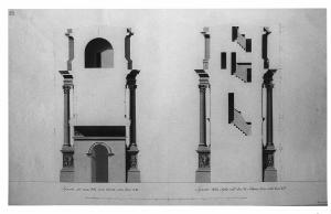 Serie di due sezioni verticali dell'Arco di Settimio Severo, a china, bistro e acquerello leggermente rosato su fondo chiaro, con linee di quota a china nera e rossa, entro linea di margine a china. Sinistra: spaccato sulla linea verticale degli archi laterali con veduta dell'apertura inf., della volta a cassettoni e delle aperture di passaggio dell'attico. Destra: spaccato sulla linea di sezione verticale del pilastro portante destro con veduta della sezione della scala interna.
