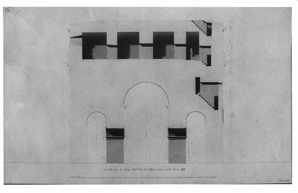 Sezione trasversale dell'Arco di Settimio Severo, a china, bistro e acquerello leggermente rosato su fondo chiaro, con linee di quota a china nera e rossa, entro linea di margine a china. Spaccato lungo la linea orizzontale dell'arco con veduta di parte delle volte di passaggio dei fornici, della sezione delle scale e delle varie aperture dell'attico.