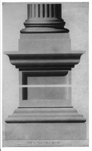 Alzato in rilievo della base del piedistallo e della base della colonna dell'Arco di Settimio Severo, a china, bistro su fondo chiaro, con linee di quota a china rossa, entro linea di margine a china.