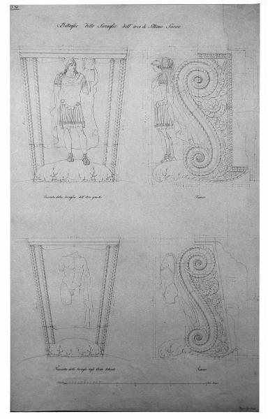 Prospetto, profili delle serraglie e sezioni degli archivolti dell'Arco di Settimio Severo a china e acquerello rosa su fondo chiaro, quotato, entro linea di margine a china. Inf.: prospetto e fianco della serraglia e sezione dell'archivolto degli archi laterali. DSup.: prospetto e fianco delle serraglie, sezione dell'archivolto dell'arco centrale.