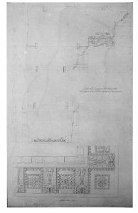 Veduta dal basso del soffitto della cornice inferiore del timpano, sezione della trabeazione dell'ordine interno del Tempio di Giove Statore, a china, bistro e acquerello rosato, quotato a china rossa su fondo chiaro, entro linea di margine a china.. Inf.: veduta dal basso del soffitto della cornice con modiglione, gocciolatoio e sezione del dentello. Sup.: alzato in sezione della trabeazione.
