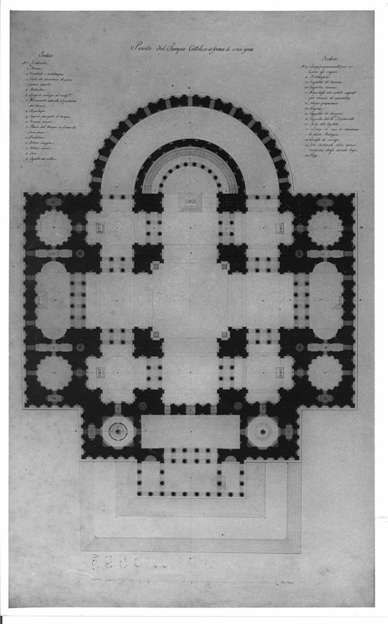 Pianta di edificio sacro a croce greca, a china rossa e dettagli acquerellati di azzurro, su fondo chiaro , entro linea di margine a china. Un'ampia gradinata precede un pronao da cui si accede ad un vestibolo e infine all'interno del Tempio; lo spazio a croce greca si definisce superiorm. con un'ampia abside e lateralmente con vari corpi di struttura articolata.
