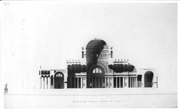Sezione del tempio cattolico, a china, bistro e acquerello rosato, su fondo chiaro con linea di margine a china. Spaccato sulla linea verticale del tempio con veduta del lato sinistro del pronao e delle capriate di copertura; del vestibolo con copertura a terrazza; della zona delle due cappelle laterali con volta a botte e cassettoni; della zona centrale e della cupola sovrastante di due cappelle laterali e della zona absidale.