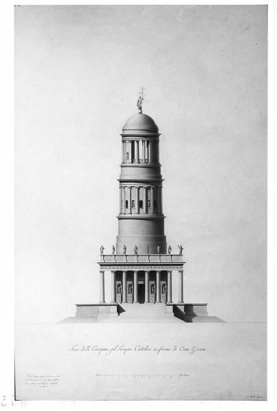 Prospetto della torre campanaria per il tempio cattolico a croce greca, a china e bistro su fondo chiaro, entro linea di margine a china. Una gradinata delimitata da due piedistalli aggettanti precede un colonnato di otto colonne a fusto liscio e capitello dorico sormontate da un fregio e da una balaustra sorreggente una serie di statue. Al centro torretta circolare con lesene terminante con una cupola liscia sorretta da una loggia. Alla sommità una statua di Cristo poggia su una sfera.