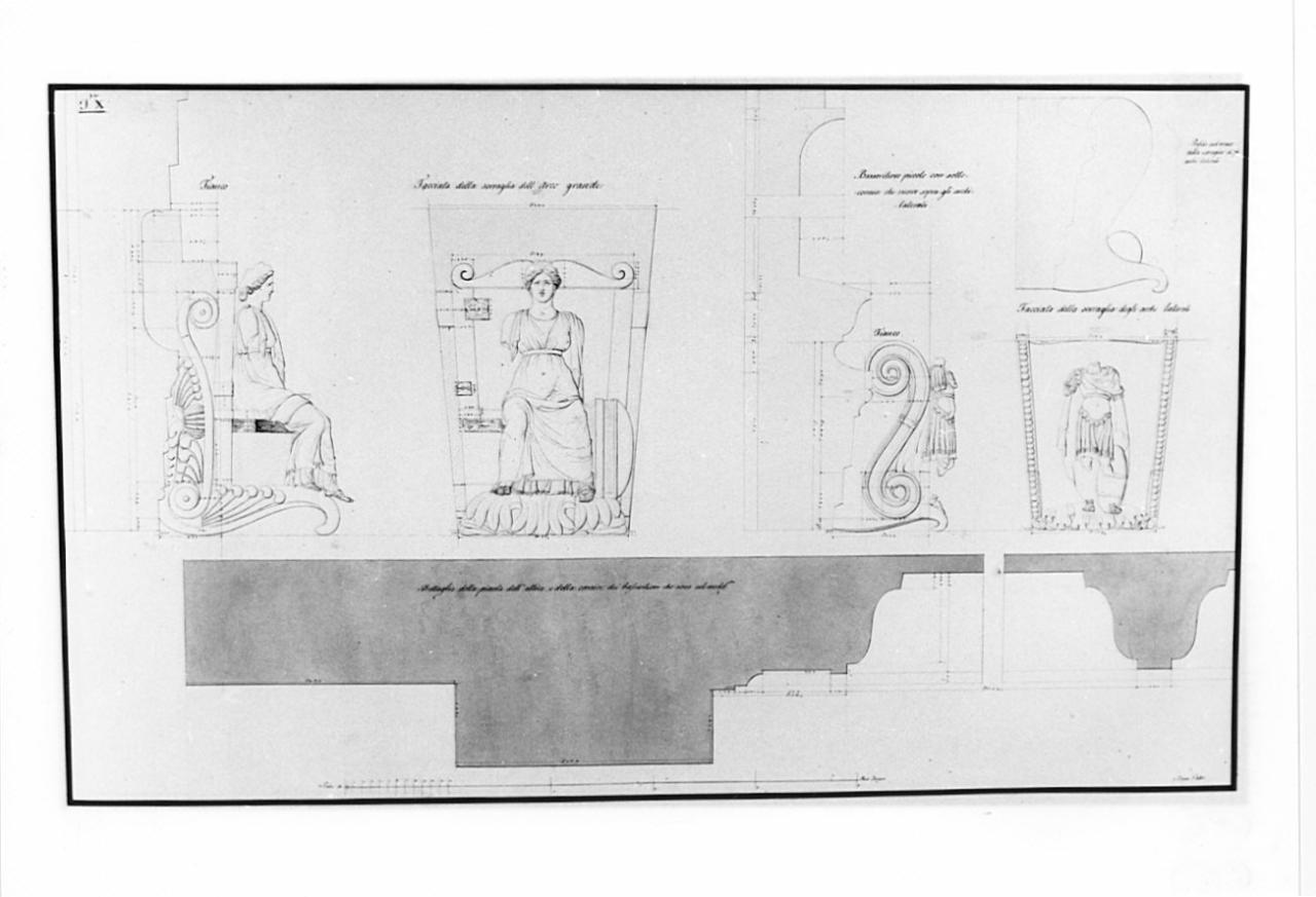 - NOTIZIE STORICO CRITICHE Il disegno appartiene ad una serie di 12 tavole redatte da Pietro Bosio nel 1812 come saggio del primo anno di pensionato a Roma; otto tavole furono esposte a Brera nel 1813 (Atti della R. Accademia di Milano, 1813, p. 57), le altre quattro nel 1818 (Atti..., 1818, p. 44). Nel 1811 Pietro Bosio fu premiato per l'invenzione al concorso di II classe a Brera (Atti..., 1811, p. 56); vinta la borsa di studio si trasferì a Roma dove visse ottenendo varie commissioni dalla sede papale. Partecipò alla ricostruzione della Basilica di S. Paolo e fu chiamato dal Canova per collaborare alla stesura del progetto del Tempio di Possagno. Il disegno è rilegato nel volume A I 189 contenente vari saggi di pensionato romano tra il 1810 e il 1817.