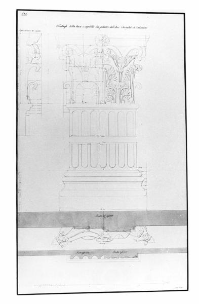 Rilievo della lesena dell'Arco di Costantino, a china, bistro e acquerello rosato, quotato, su fondo chiaro, entro linea di margine a china. Inf.: sezione orizzontale a due livelli del capitello.