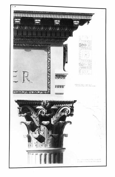 Rilievo del Tempio di Giove Tonante, a china, bistro su fondo chiaro, con numeri di quota a china rossa, entro linea di margine a china. Alzato di parte del capitello e della trabeazione, sezione del capitello e veduta dal basso verso l'alto del soffitto dell'architrave.
