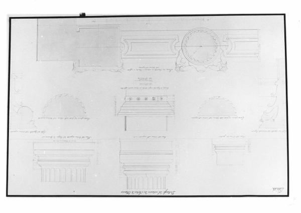 Progetto di restauro di una serie di dettagli dei Portici d'Ottavia a china, leggermente ombreggiati, quotati in rosso, su fondo chiaro, entro linea di margine a china. Sezione trasversale dei portici con veduta della pianta del capitello, colonna e pilastro. Due profili dei capitelli con relative sezioni del fusto delle colonne. Tre alzati delle basi delle colonne e della cornice dell'imposta degli archi.