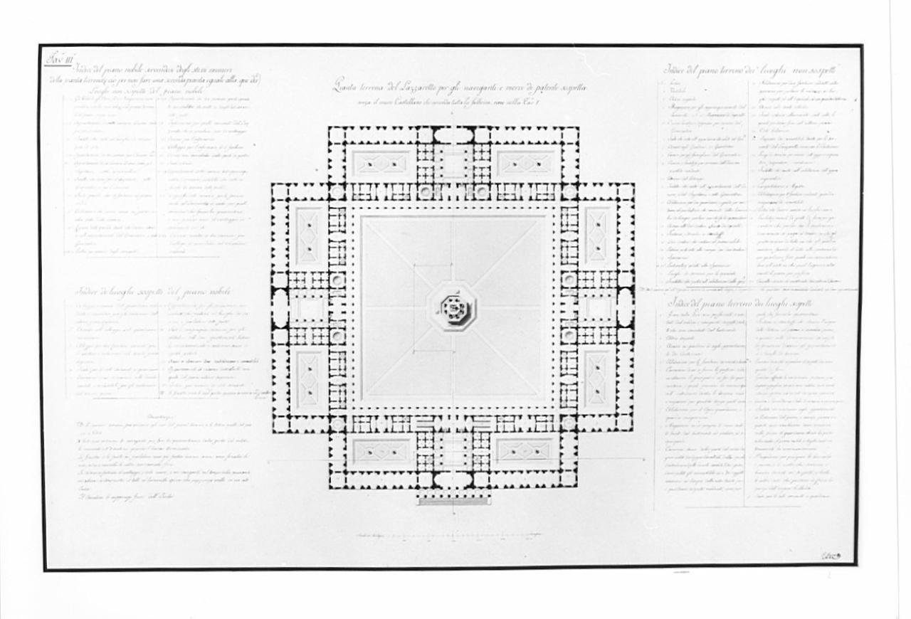 Pianta del Lazzaretto marittimo a china nera e rossa, con linee di sezione AB CD su fondo chiaro, entro linea di margine a china. Ampia descrizione dei vani e degli utilizzi. Veduta del piano terra, a croce greca, costituito da un cortile interno porticato interno con cappella centrale. Intorno al cortile serie di vani divisi da giardini, due per lato. Sugli angoli quattro scale circolari danno accesso ai piani superiori.
