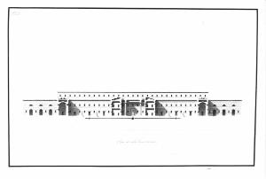 Spaccato del Lazzaretto marittimo a china, bistro e acquerello beige su fondo chiaro, entro linea di margine a china. Sezione orizzontale sulla linea CD, tav. III, del corpo di fabbrica di fronte al porto con veduta, al centro, dell'atrio scoperto, dei due giardini attigui, ornati da quattro statue e dei magazzini di deposito laterali.
