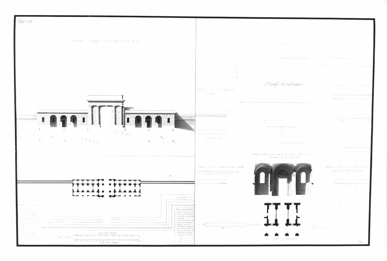 Piante, prospetti e sezioni relative al Lazzaretto marittimo a china, bistro e acquerello beige, rosa e azzurro su fondo chiaro, entro linea di margine a china. Sinistra: pianta a alzato della porta d'ingresso e del muro che circonda il Lazzaretto. Destra: serie di dieci dettagli tra piente, alzati e spaccati degli ornamenti.