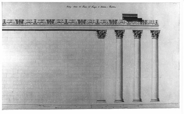 Alzato del Tempio di Antonino e Faustina a china e bistro, quotato, su fondo chiaro, marginato in azzurro, su fondo chiaro. Veduta del fianco della cella e di tre colonne del pronao. Architrave inciso con soggetti raffiguranti leoni, lucerne e tralci.