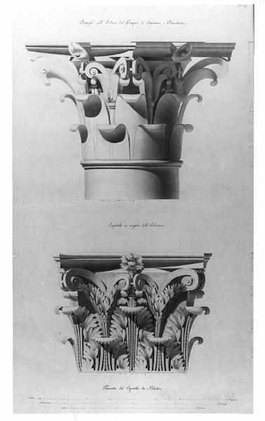 Alzato dei capitelli delle colonne del Tempio di Antonino e Faustina a china e bistro, quotati, su fondo chiaro, marginato in azzurro, su fondo chiaro. Prospetto del capitello dei pilastri e alzato del capitello d'angolo delle colonne.