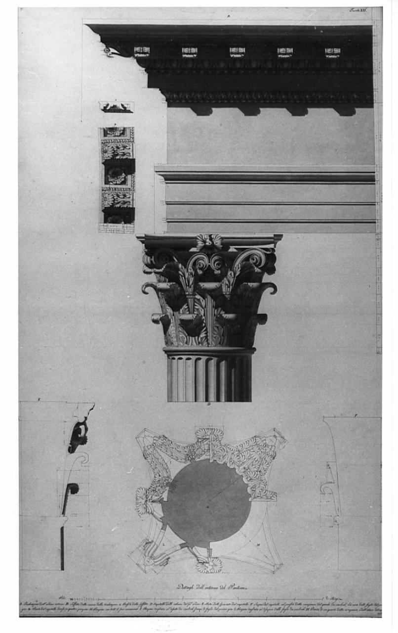 Rilievo del capitello interno del Pantheon a china, bistro e acquerello, su fondo chiaro, quotato, entro linea di margine a china e bordo azzurro. In basso: sezione orizzontale su quattro livelli del capitello, spaccato dello stesso e sezione sulla campana. In alto: alzato della trabeazione interna, veduta dal basso verso l'alto del soffitto della cornice e sezione della stessa. In bassp, indice e lettere di riferimento.