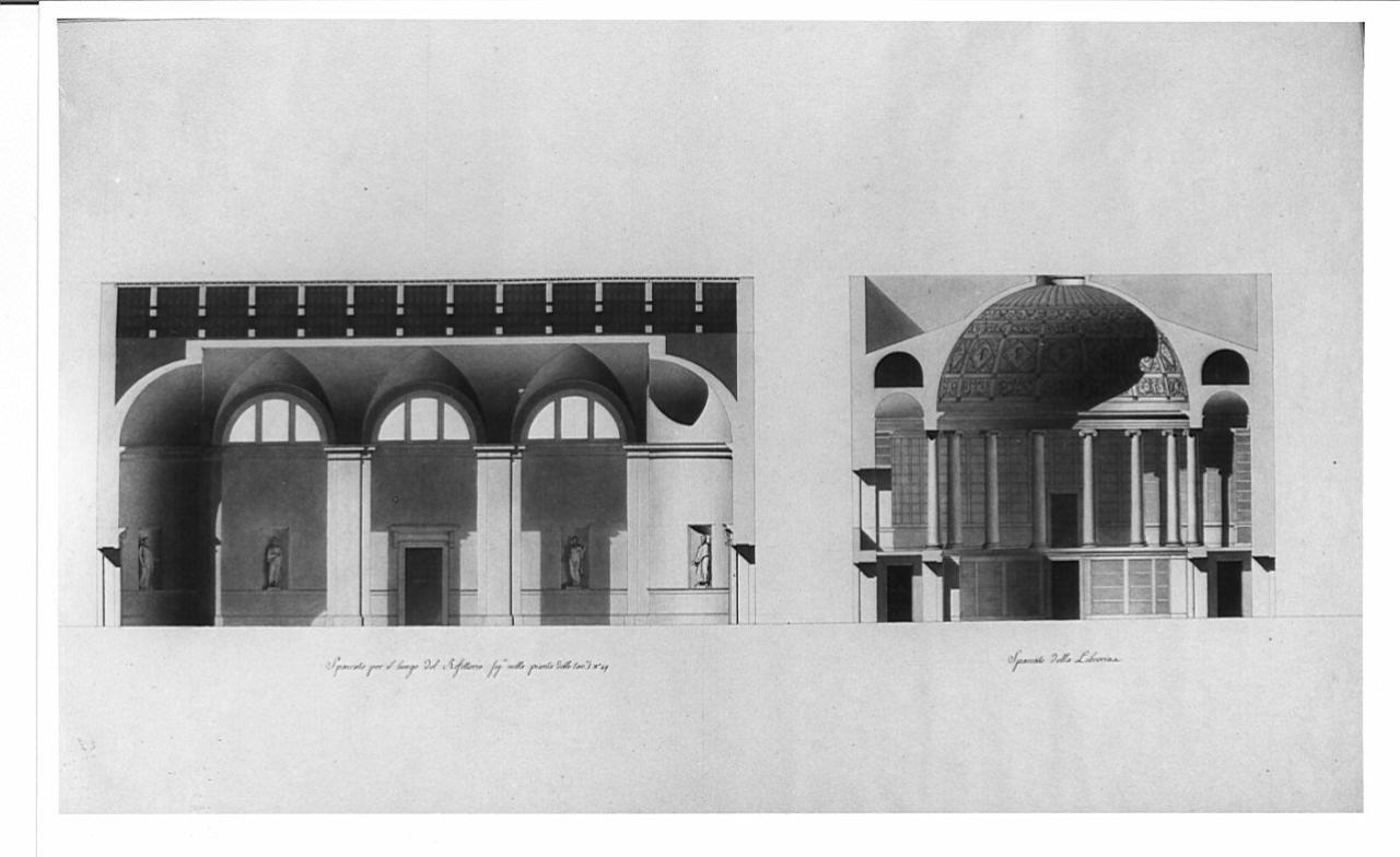 SpaccatI del Collegio di Educazione, a china, bistro e acquerello rosa su fondo chiaro, entro linea di margine a china e bordo grigio azzurro. Sezione longitudinale del refettorio con veduta dei pilastri, delle pareti lisce con nicchie e finestre termali. Spaccato della libreria con veduta del vano circolare colonnato e coperto dalla cupola.