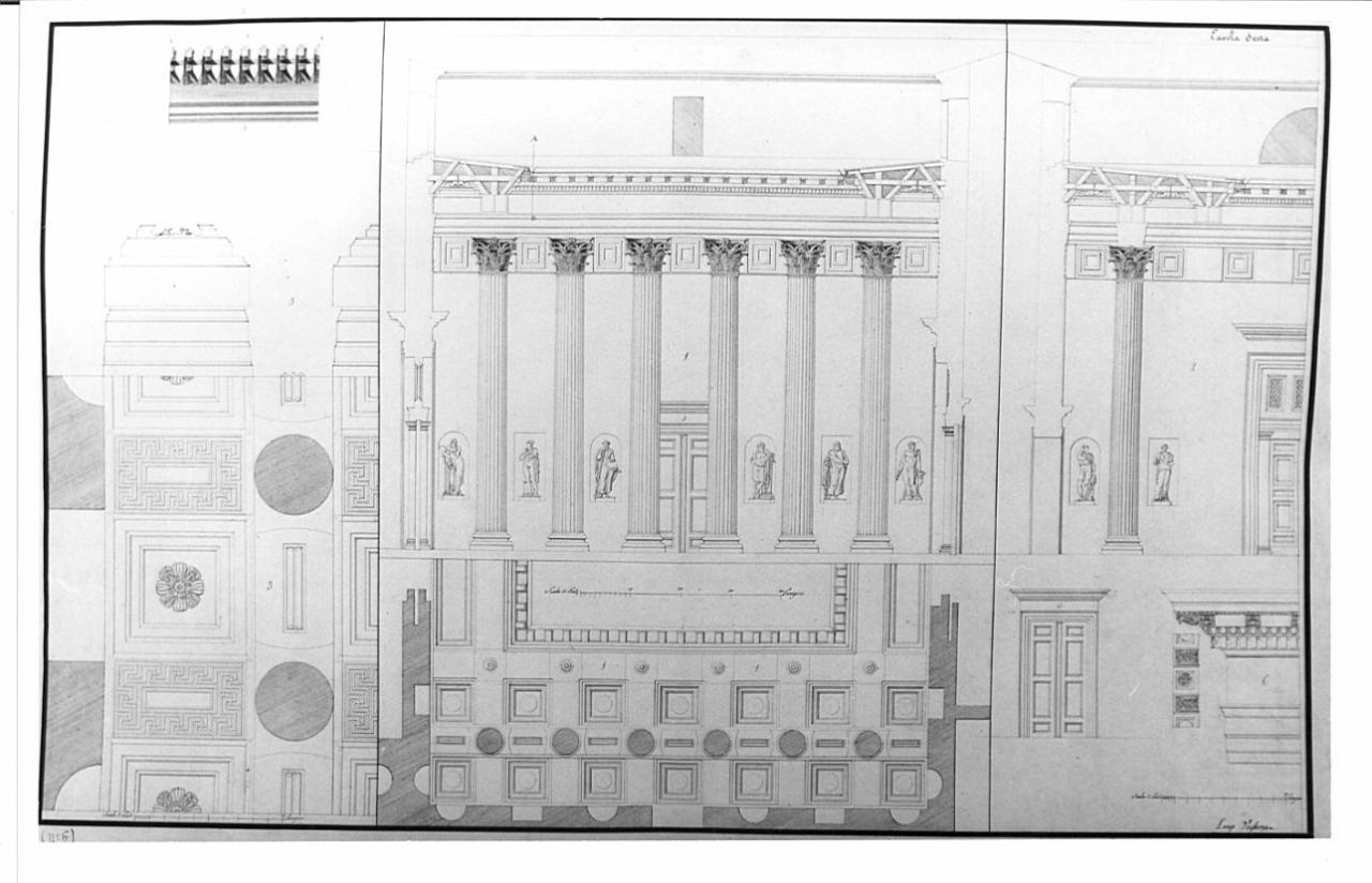 Studio dei particolari costruttivi dell'Accademia, entro margine. Tavola divisa i n tre parti. A sinistra: inf., particolare della sezione orizzontale sulle colonne e sulla muratura con vista verso il soffitto a cassettoni; particolare della stessa scala della sezione verticale sul fregio e sui cassettoni. Sup.: particolare della sezione verticale sulla struttura della copertura in legno. Al centro inf.: sezione orizzontale con vista verso il soffitto a cassettoni dell'atrio. Sup.: sezione verticale dell'atrio. A destra inf.: prospetto della porta d'ingresso al cortile centrale e metà della sezione verticale dell'atrio perpendicolare alla precedente.