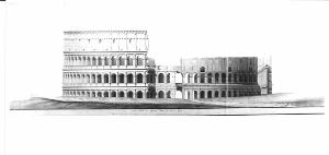 Prospetto dello stato di conservazione dell'Anfiteatro nel 1809: l'edificio era privo di anello esterno, con piano terreno in parte interrato color grigio entro margine. Destra: gallerie anulari interne sottostanti la cavea. Facciata (in bistro) formata sulla destra da quattro piani (tre loggiati e uno in muratura) separati da cornici marcapiano (dentellata al terzo piano). Edificio a pianta ellittica con tre piani con ordini sovrapposti: dorico, ionico, corinzio e quarto piano con paraste corinzie su alta base. Le arcate sono formate dal sistema arco pilatsro - semicolonna numerate. La muratura del quarto piano ha finestre rettangolari tra paraste coronata da trabeazione con architrave a segmenti interrotti, ed è percorsa da una serie di mensole sporgenti (sparti infissi).