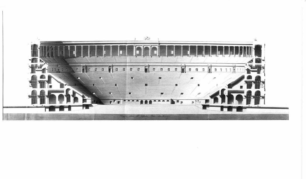 - NOTIZIE STORICO CRITICHE Il disegno appartiene ad una serie di tavole redatte da Luigi Voghera nel 1810 come saggio di fine anno del pensionato a Roma. Luigi Voghera nasce a Cremona nel 1788. A 17 anni frequenta l'Accademia di Brera distinguendosi in numerosi concorsi. Tra le prime opere, frutto dell'esperienza maturata presso la sezione civile del Genio Militare, vanno ricordate il progetto per la Caserma S. Ambrogio e il restauro della facciata del Castello Sforzesco. Numerose le opere realizzate da Luigi Voghera nelle province di Mantova, Cremona, Brescia, Parma e Piacenza. Per citarne alcune, ricordiamo: Favagrossa a Casal Maggiore (1816), sede della Filanda Bertarelli a Cremona (1834), la Villa Manfredi a Cigignolo (1839) e il campanile della chiesa di San Siro a Soresina (1839). Luigi Voghera vinse il pensionato a Roma nel 1809, dove soggiornò dal 1809 al 1811. Il progetto di restauro dell'Anfiteatro Flavio venne presentato nel 1810 come saggio del secondo anno. La cartella n. 6 contiene anche i saggi del primo e del terzo anno di pensionato, relativi al rilievodell'Anfiteatro Flavio e al progetto per una Accademia di Belle Arti.