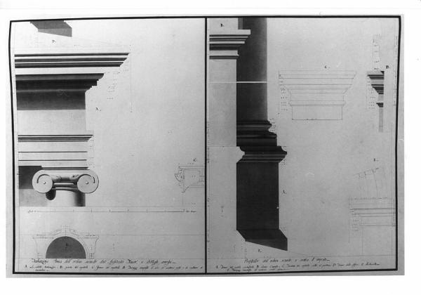 Particolari del progetto di restauro dell'Anfiteatro Flavio, Tavola divisa in due parti. A sinistra ordine ionico, sezioni in alzato color rosato in pianta color grigio. A sinistra in basso sezione sul fusto della colonna con pianta del capitello. A sinistra in alto: prospetto del capitello e della trabeazione, sezione sul piedistallo con vista del piedistallo dell'ordine secondo e cornice d'imposta. A destra in basso: prospetto della trabeazione e cornice d'imposta. A destra in alto: sezione sulla trabeazione con vista del capitello della colonna. A destra al centro: prospetto del capitello.
