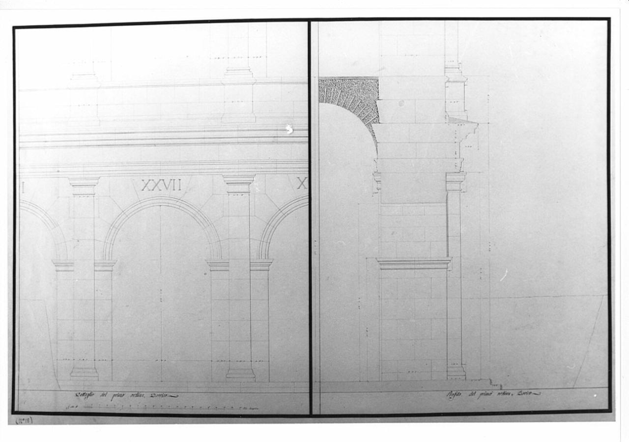 Particolari del primo piano di arcate dell'Anfiteatro Flavio, entro margine. Sezione color rosato. Schema dei blocchi di pietra della muratura. Tavola divisa in due parti: a sinistra prospetto dell'arcata dell'ordine dorico, basamento dell'arcata del secondo piano. Arco che poggia su pilastri (con trabeazione) con addossate semicolonne. Numero romano sopra l'arco (XXVII). A destra sezione verticale sulla mezzeria delle arcate e sulle volte perpendicolari all'andamento dell'anello con evidenziazione dei materiali e vista dell'ordine dorico e del pidistallo dell'ordine superiore.