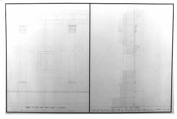 Particolari del quarto piano dell'Anfiteatro Flavio, entro margine. Sezione color rosato. Tavola divisa in dua parti: a destra, sezione sulla mensola e finestra con vista dell'ordine composito e la cornice terminale; a sinistra, prospetto della muartura esterna del quarto piano con paraste. Finestra rettangolare al centro con sup. mensole. Trabeazione a segmenti con cornice dentellata.