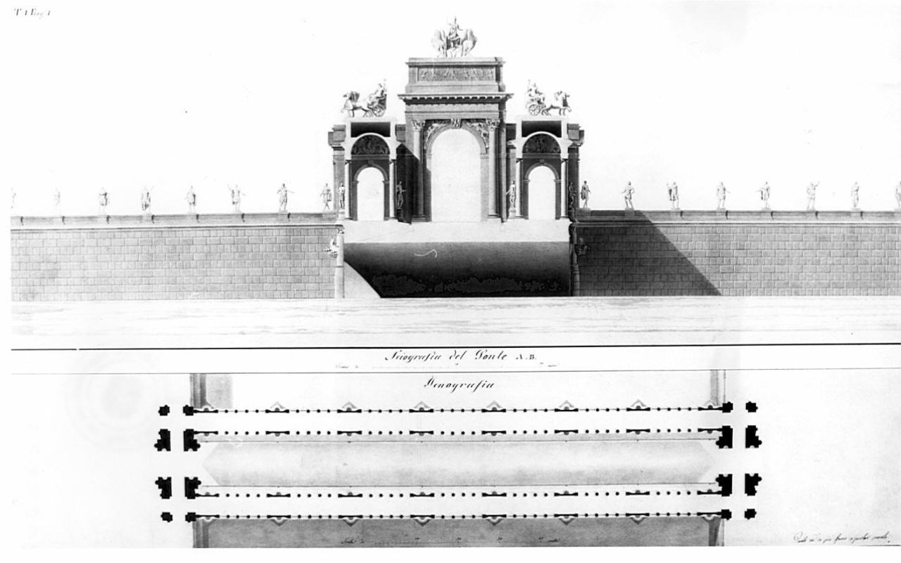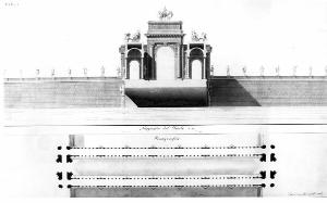 Progetto di Ponte Trionfale entro margine grigio. lnf.: planimetria formata da 3 passaggi paralleli. Quello centrale è scoperto mentre le gallerie sono coperte con volte a botte; i passaggi sono separati da 7 serie di 4 colonne ciascuna intervallate da setti murari con piedistalli. Alle estremità: 2 arcate trionfali a 3 archi passanti. Sup.: sez.trasversale sul ponte con vista dell'ingresso trionfale. La volta a botte delle gallerie è sostenuta da colonne ioniche; al centro la trabeazione dell'arco con cornice magg. è sostenuta da 2 semicolonne corinzie e sostiene un alto basamento.