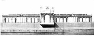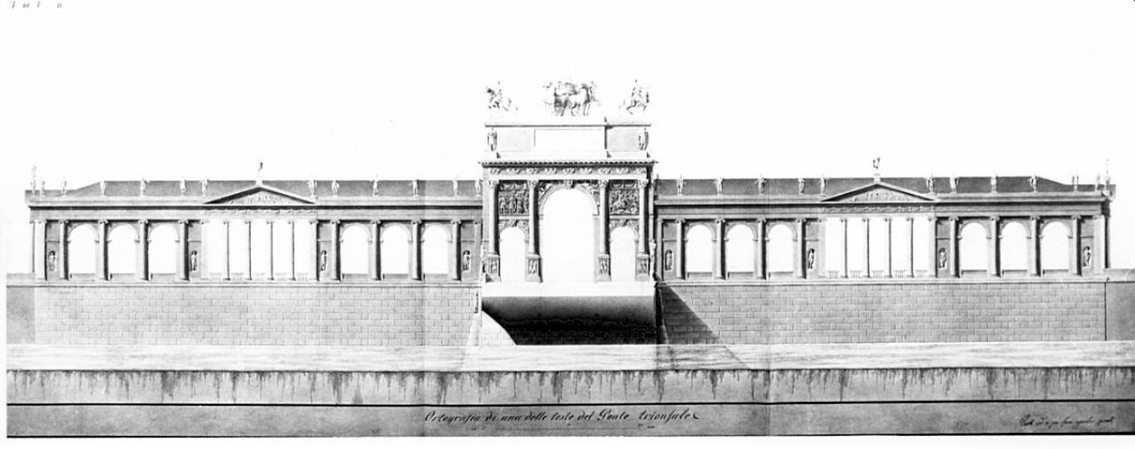 Sezione e veduta d'ingresso entro margine grigio, sezione del Ponte in acquarello rosa. Al centro arco trionfale a tre fornici di ordine corinzio decorato con architrave a tre fasce, fregio con motivi naturalistici, cornice. Sup.: attico con sestiga al centro e due statue equestri ai lati. Fiume in acquarello azzurro.