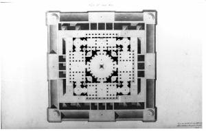 Pianta del primo piano (con vista delle coperture del piano terra) di superficie inf.a quella del pianterreno. Lo spazio è organizzato attorno ad una grande sala circolare interamente colonnata con intercolumnio costante anche in corrispondenza dei 4 ingressi, inscritta in pianta quadrata, agli angoli della quale sono ricavati vani circolari comunicanti con i 4 vestiboli sugli assi ortogonali e direttamente comunicanti con l'esterno. I vestiboli colonna ti sono accessibili mediante scalinate.