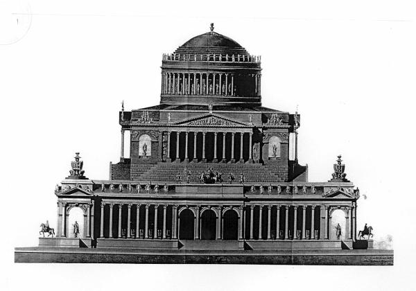 Prospetto di uno dei lati del Mausoleo avente forma piramidale data dalla successione scalare dei tre piani. L'ordine delle colonne è corinzio. Centralmente è posto l'ingresso, preceduto da una scalinata e costituito da un arco trionfale a tre fornici di uguale altezza sovrastato da un attico con gruppi scultorei e sestiga al centro. Il primo piano posto su alto basamento bugnato si raccorda al piano terreno mediante una scalinata. Nella parte centrale un grande pronao a dieci colonne su base. La trabeazione liscia è sormontata da timpano triangolare. Ai lati due grandi arcate a cielo accolgono piedistalli con statue. L'edificio è coronato da cupola su alto tamburo circondato da peristilio. Lateralmente sono visibili i profili dei lati perpendicolari.