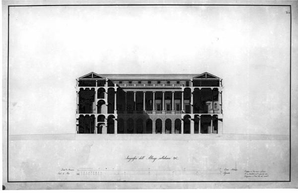 - NOTIZIE STORICO CRITICHE Il disegno fa parte di una serie di 8 tavole redatte da Aluisetti per il grande Concorso bandito dall'Accademia nel 1819. Aluisetti vince il primo premio ed il suo progetto viene esposto a Brera nel 1819 (Atti, p. 36 ). L'attività dell'architetto è legata al progetto per il Cimitero Monumentale di Milano (1839) e per l'Ospedale Fatebenesorelle (1836-40). Nel 1821 pubblica con F. Pizzagalli e il pittore C. Banfi il Primo quaderno delle opere dei grandi Concorsi premiate in Milano per le classi di architettura, pittura, figura e ornato. Tra il 1832 e il 1844 esegue le tavole illustrate dell'opera di J.Stuart e N.Revett Les antiquités d'Athènes per la versione italiana.