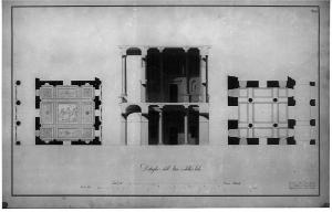 Progetto di un Grande Albergo a china, bistro e acquerello beige e rosa. Centro: sezione con vista dell'atrio e della sala con sezioni acquarellate di rosa e beige. Ds: veduta dal basso verso l'alto del soffitto dell'atrio con sezione delle colonne e del portico esterno. Sin: veduta dal basso verso l'alto del soffitto della sala coni sezione sulle colonne ioniche della loggia.