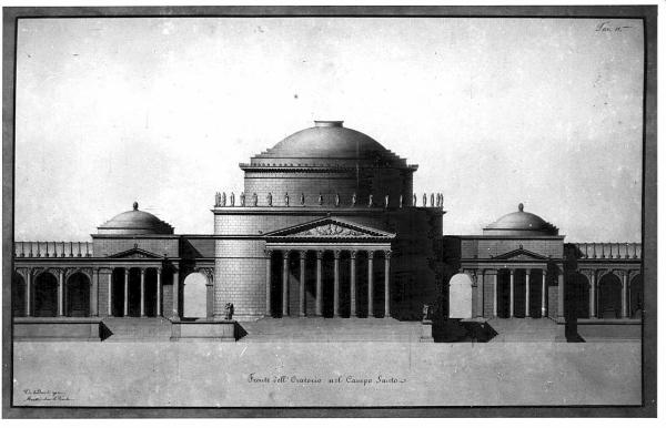 Un Campo Santo quadrato rinchiuso da portici atti a collocarvi interamente in giro memorie e monumenti d'illustri defunti. architettura: campo santo (prospetto dell'oratorio)