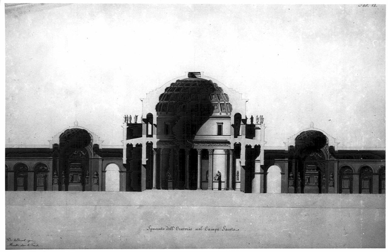 Un Campo Santo quadrato rinchiuso da portici atti a collocarvi interamente in giro memorie e monumenti d'illustri defunti. architettura: campo santo (sezione dell'oratorio)