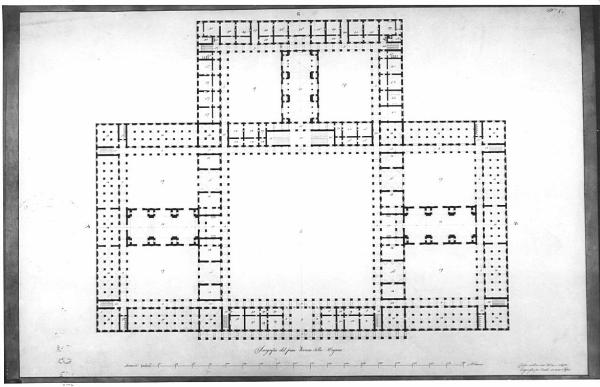 Disegno a china, del piano terreno di una dogana, con proiezione di volte e soffitti in china rossa e numeri di riferimento ad una legenda non allegata. Edificio a pianta simmetrica costituito da un corpo principale quadrato con cortile porticato affiancato su tre lati da corpi secondari anch' essi distribuiti attorno a corti porticate.