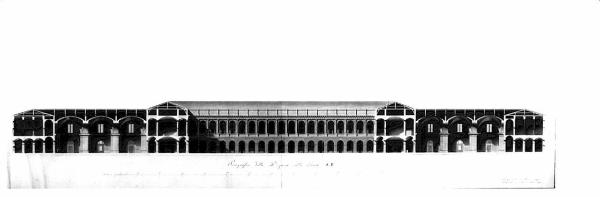 Sezione trasversale passante per la mezzeria del cortile principale che presenta piano terreno a portico bugnato sovrastato da loggiato ad archi con colonne addossate. Ai lati, in sezione, due sale daziarie simmetriche costituite da tre ambienti coperti a volta a crociera.