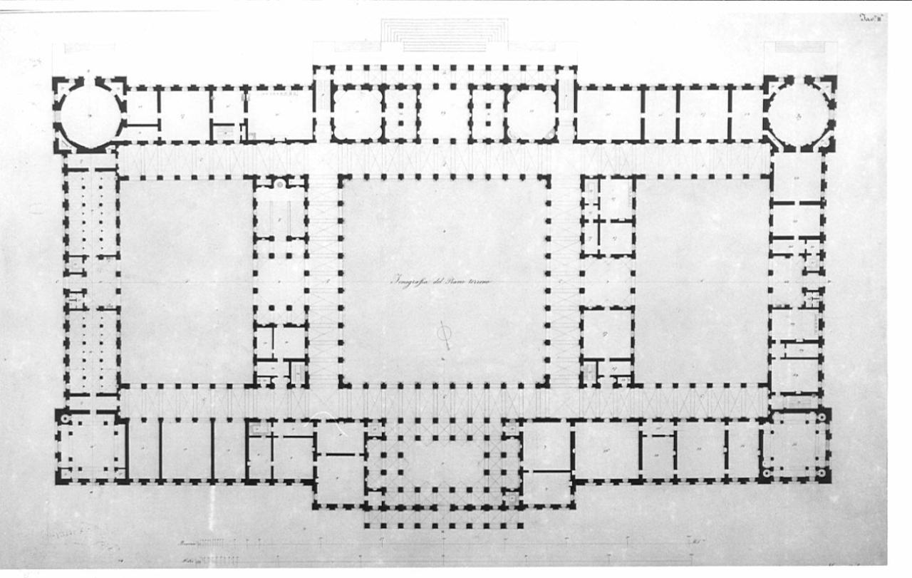 Pianta del piano terreno del palazzo con vista delle proiezioni delle coperture (linee tratteggiate) e numeri di riferimento a legenda che non è allegata al disegno. Linee di sezione in china rossa. L'edificio è a pianta rettangolare con ingresso centrale leggermente aggettante e porticato. Agli angoli sono poste grandi sale: quadrate sul lato d'ingresso, circolari sul lato posteriore. L'accesso al giardino è preceduto da una scalinata.