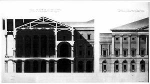 La tavola è divisa in due parti: a sin. la sezione trasversale della gran Sala d'adunanze posta al di sopra dell'atrio di ingresso. Sezione delle murature in acquarello rosa e sezione delle capriate lignee in acquarello giallo. Vista dell'interno della sala con colonne in ordine corinzio gigante e della parete di fondo decorata da statue entro nicchie. Le pareti sono decorate con cornici, bassorilievi entro riquadrature e festoni. A ds. è illustrato il particolare dell'ingresso principale. Vista del dettaglio dei capitelli compositi del piano nobile e delle finestre con timpano e balaustra.