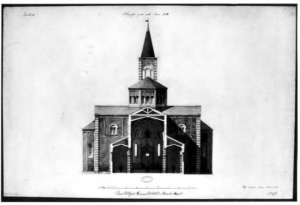 Una chiesa parrocchiale cui siano annesse le abitazioni del parroco... erette nello stile dell'architettura italiana del XIII secolo. architettura: chiesa (sezione)