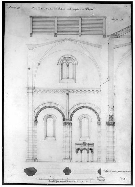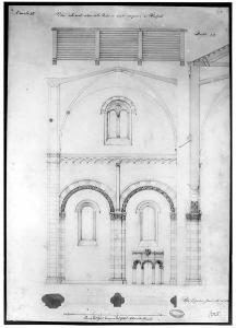Particolare di una arcata interna di chiesa con murature sezionate in acquarello rosa, parti in pietra a tratteggio in matita, parti in legno colorate in giallo e parti in ferro della struttura del tetto in inchiostro blu. In alto disegno del particolare della copertura e a ds. sezione della muratura e in parte della copertura.