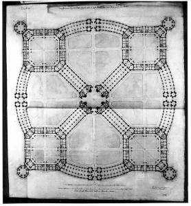 Pianta di edificio di forma complessa, costituita da vasto porticato circolare con 4 ingressi simmetrici, suddiviso da due diametri perpendicolari, con 4 corpi poligonali posti simmetricamente all'estremità dei diametri. Al centro corpo ottagonale dal quale partono i diametri porticati che conducono ai 4 corpi simmetrici. All'interno vaste aree libere (giardini o cortili) campite in acquarello verde.